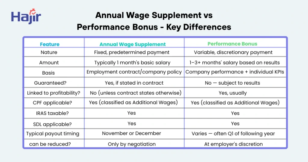 The major difference is that AWS represents a contractual award, while a performance bonus remains discretionary. A performance bonus is based on company performance or personal KPI. Once the employment contract includes AWS, the employer must pay it. Employers cannot reduce or remove AWS because of a poor quarter. They must formally negotiate any changes with employees.