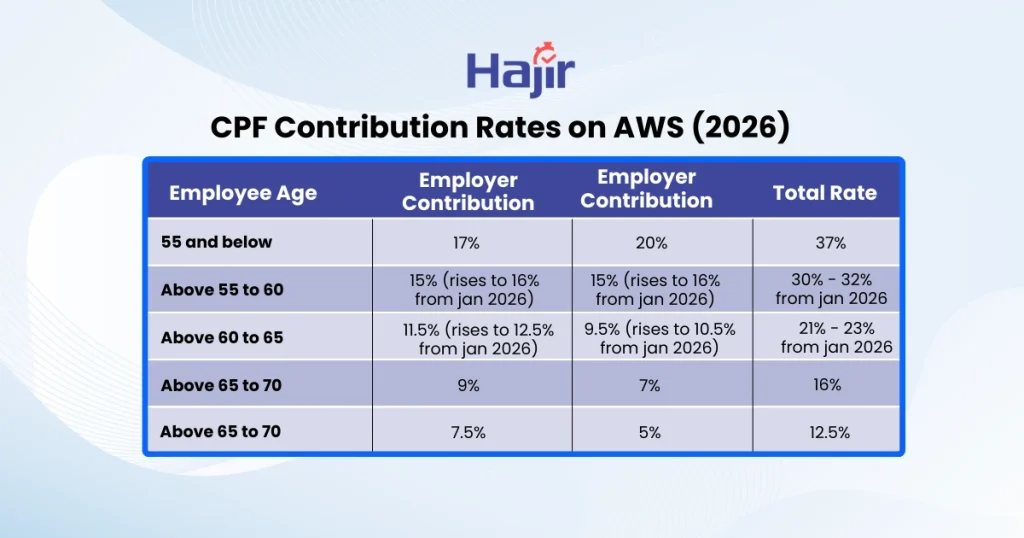 CPF contribution rates for AWS are the same as those applied to monthly ordinary wages. The rates depend on the employee’s age, citizenship status, and years of PR status.